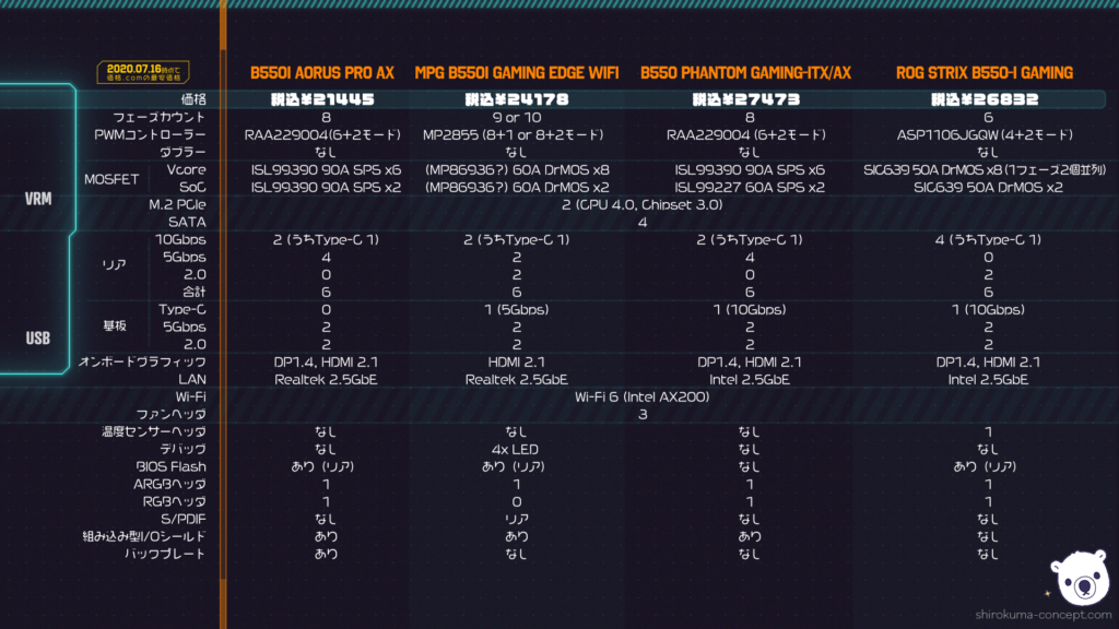 テーブルを見ればわかると思いますが、みんなも持ってるBIOS Flash機能がなくて、ROG STRIX B550-I GAMINGより多く払ったお金から得られるものは何かというと、少し上のVRMくらい…?